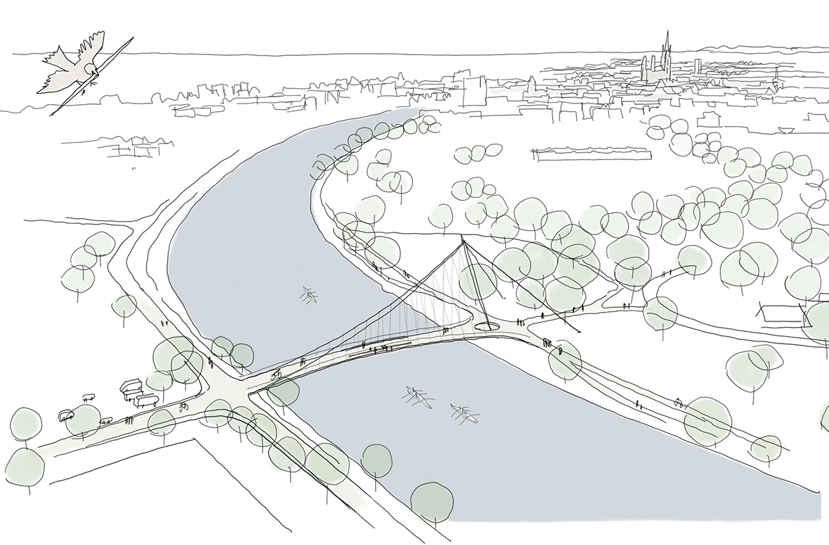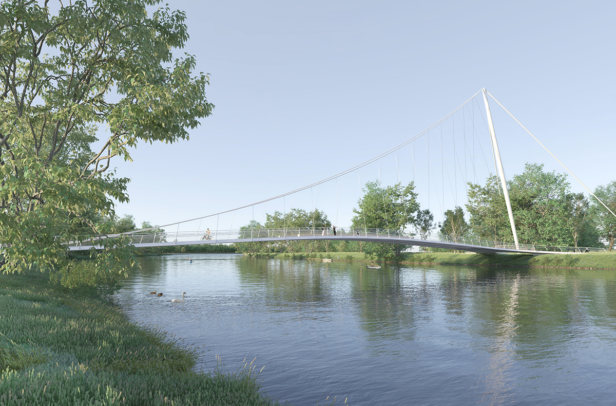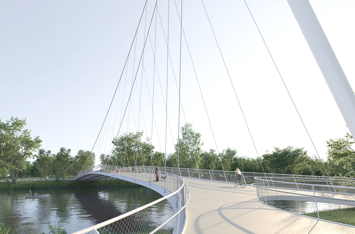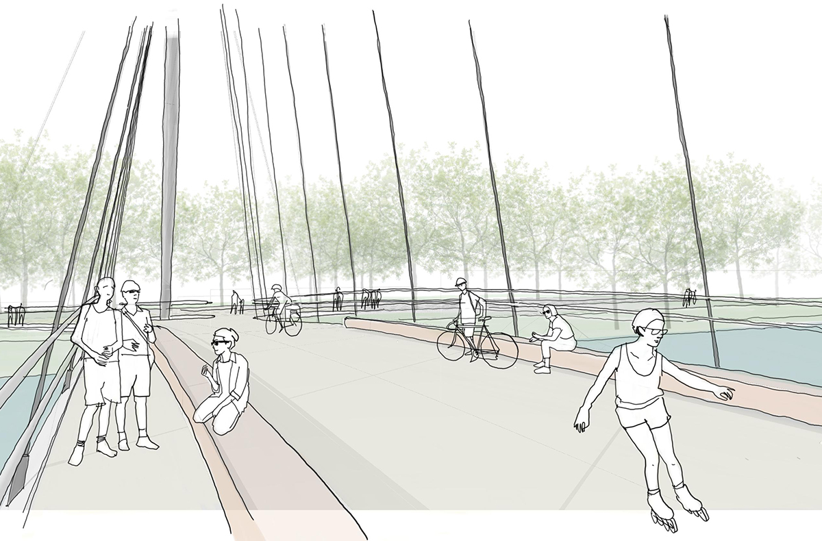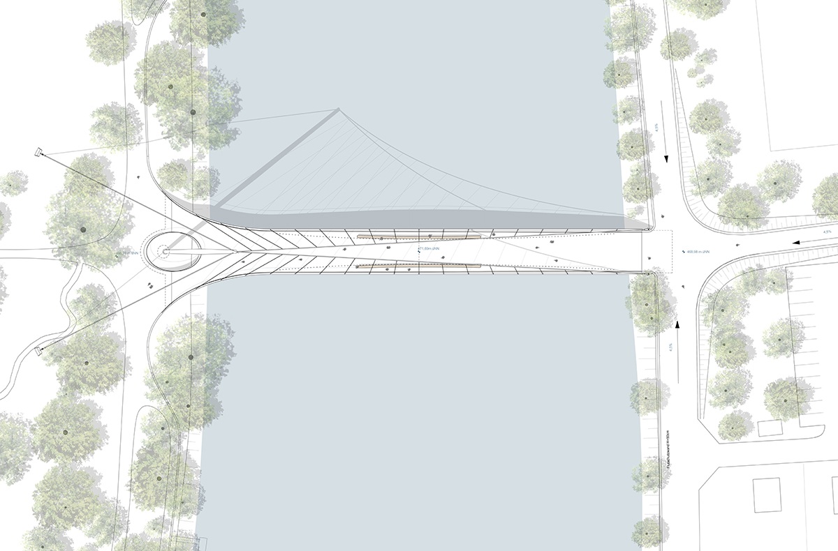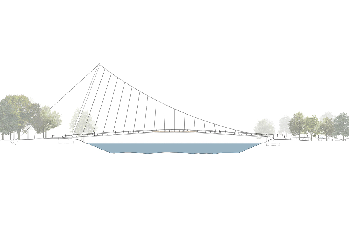 In the west, an elliptical cut-out in the bridge contour creates a fork in the path, which harmoniously directs traffic flows into the park landscape’s network of paths while dynamically incorporating the main cycle route to the south. The elliptical bridge eye accommodates the base of the pylon construction and is sensitively embedded in the bank area.