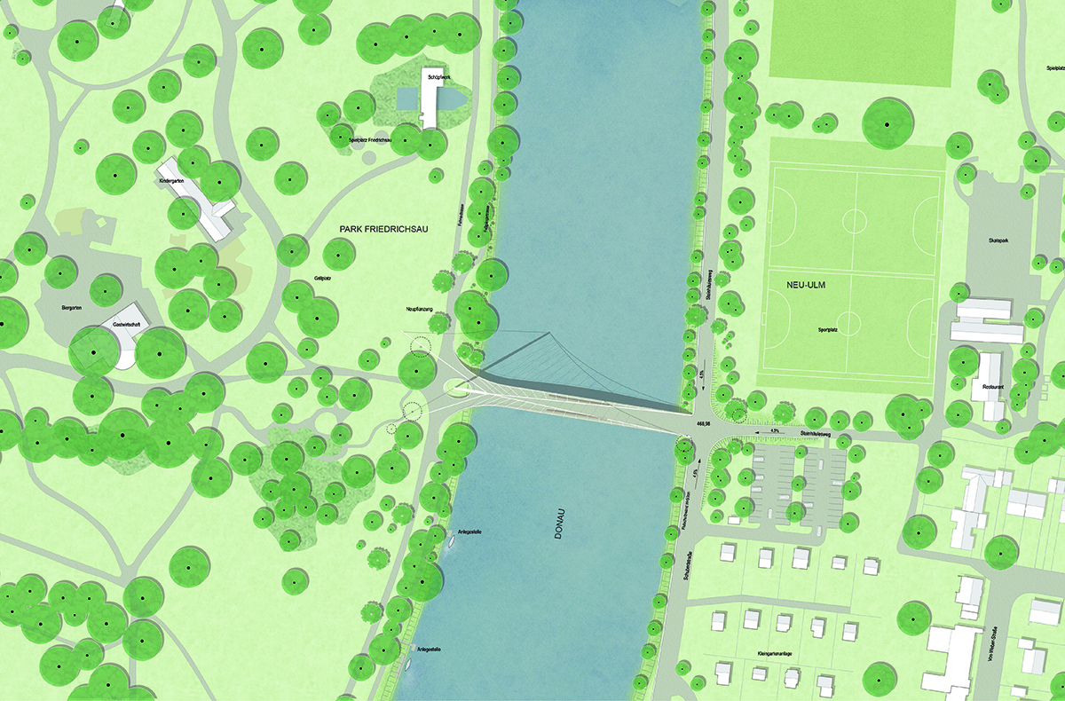 The new Friedrichsau bridge spans the Danube at the same location as the existing bridge, which is to be dismantled, and connects the Friedrichsau parkland in the west, which belongs to the city of Ulm, with the Neu-Ulm district of Offenhausen in the east. The new bridge is designed as a slender steel suspension bridge with a single-sided, sloping pylon. Positioned on the western side of the park, the pylon blends sensitively into the tree-lined landscape and at the same time gives the bridge a distinctive, identity-creating presence: its sloping position acts as a welcoming gesture to the Neu-Ulm side.