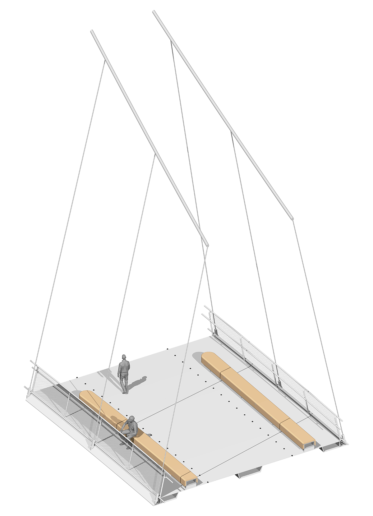 In the middle of the Danube, at the border between Baden-Württemberg and Bavaria, a lounge area with benches is being created on the bridge, inviting visitors to linger and enjoy the river surroundings. The bridge is 5.4 metres wide between the benches on either side. At the eastern end, it widens to 7.8 metres to accommodate the mixed traffic of pedestrians and cyclists at the intersection. The bridge also opens up to the west, with the path through the bridge eye blending harmoniously into the landscape.