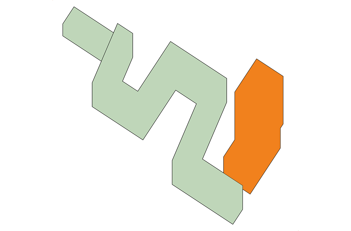 Die Außenbereiche der Wohnbebauung werden durch die Figur der Gebäude zoniert. Die Freiflächen von Mäander und Hochhaus greifen ineinander über, sie sind nicht eingefriedet, sondern öffentlich durchwegt