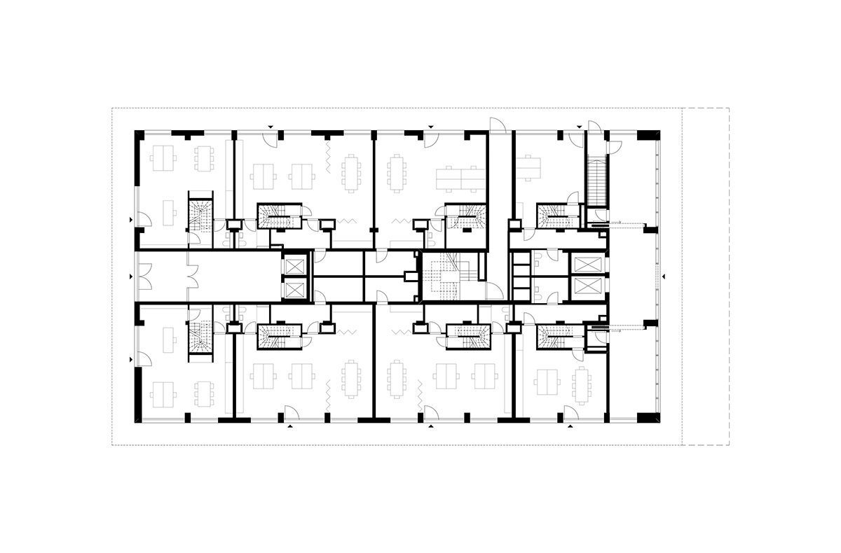 Die tragenden Geschossdecken sind als Halbfertigteilkonstruktionen (Filigrandeckenelemente mit Ortbetonergänzung) bei einer Spannweite von 7,50 m in beiden Richtungen geplant. Die Decken lasten auf Fertigteil-unterzügen auf. Die vertikale Lastableitung erfolgt über den Erschließungskern und einige Wände in aussteifenden Achsen, sowie die Stahlbetonstützen im Achsraster. Die umlaufend frei auskragenden Balkonfertigteile binden mittels Isokörben in den Deckenkonstruktionen ein.