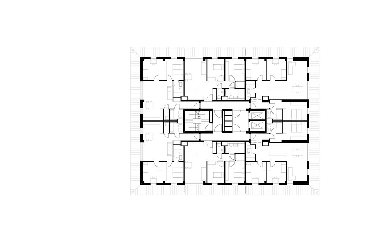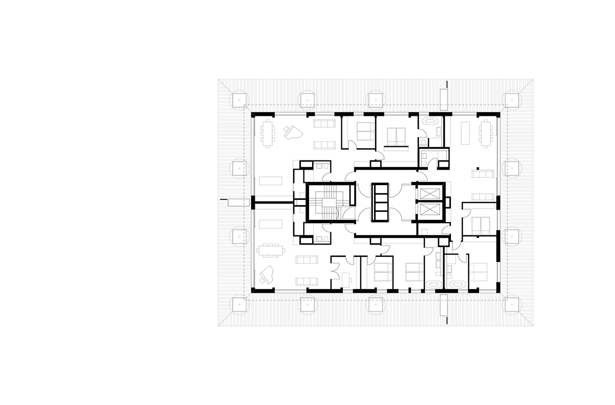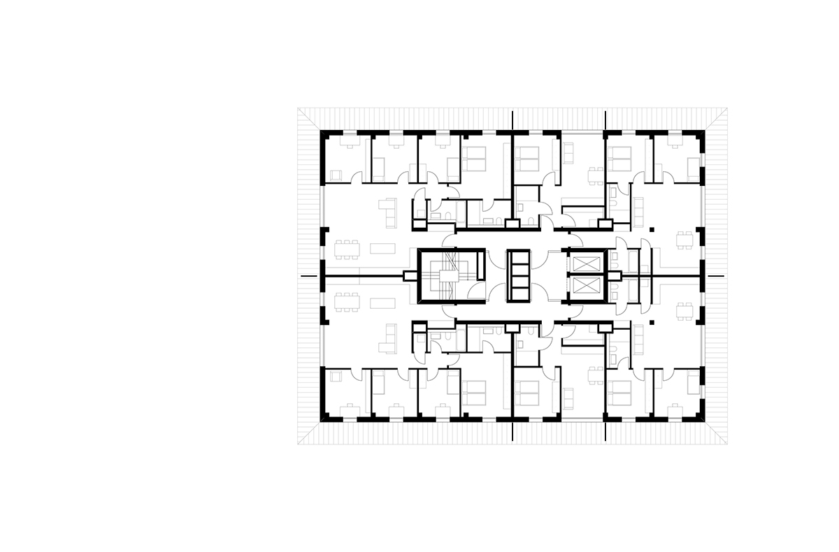 Um den Kern sind unterschiedliche Wohnungstypen (1-bis 5-Zimmer-Wohungen) angeordnet.
