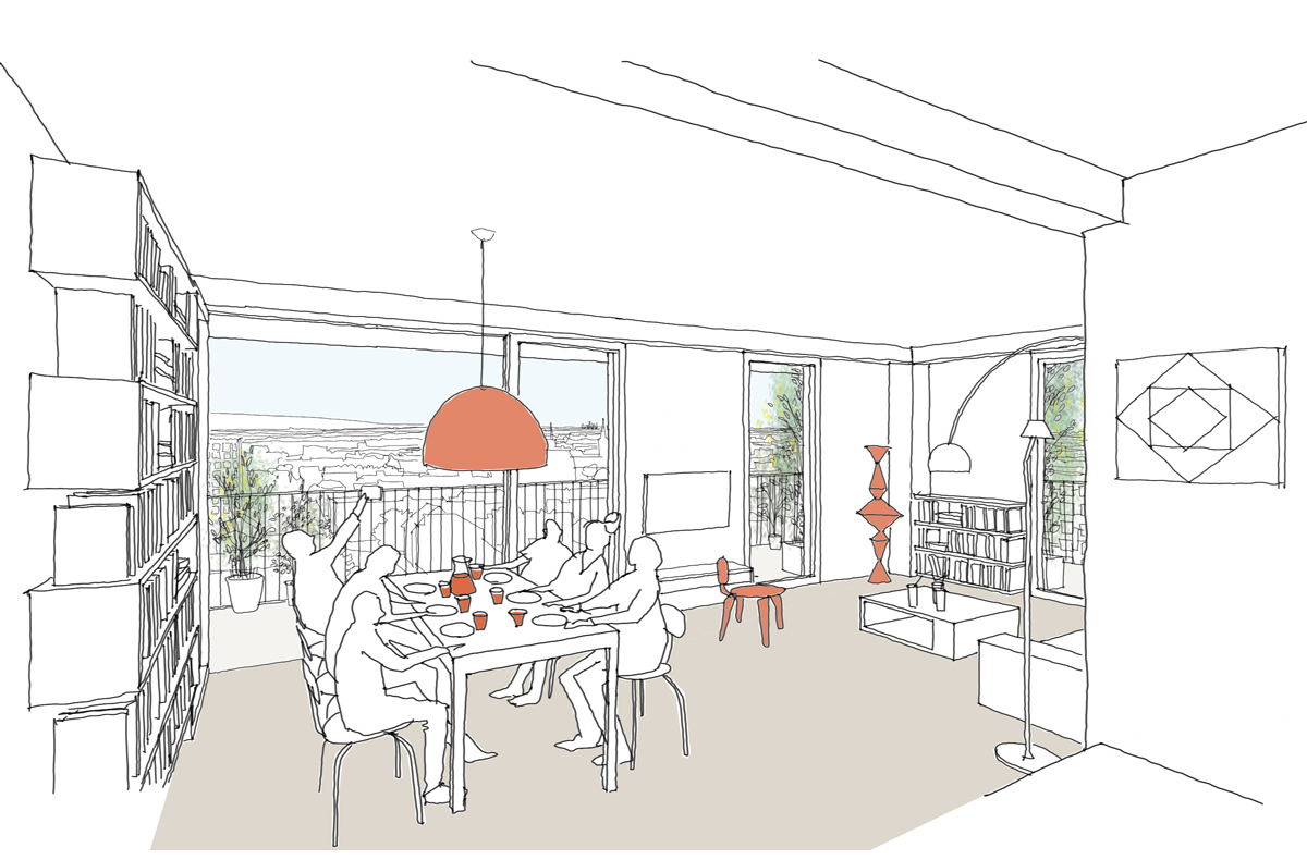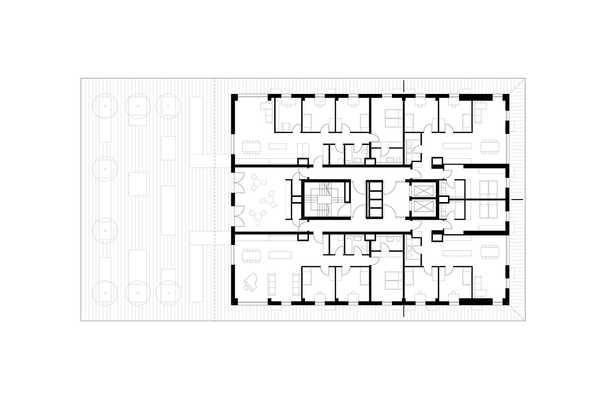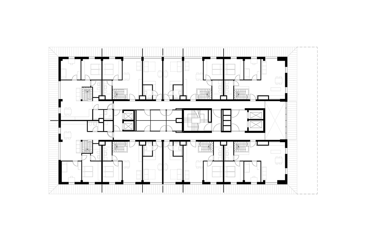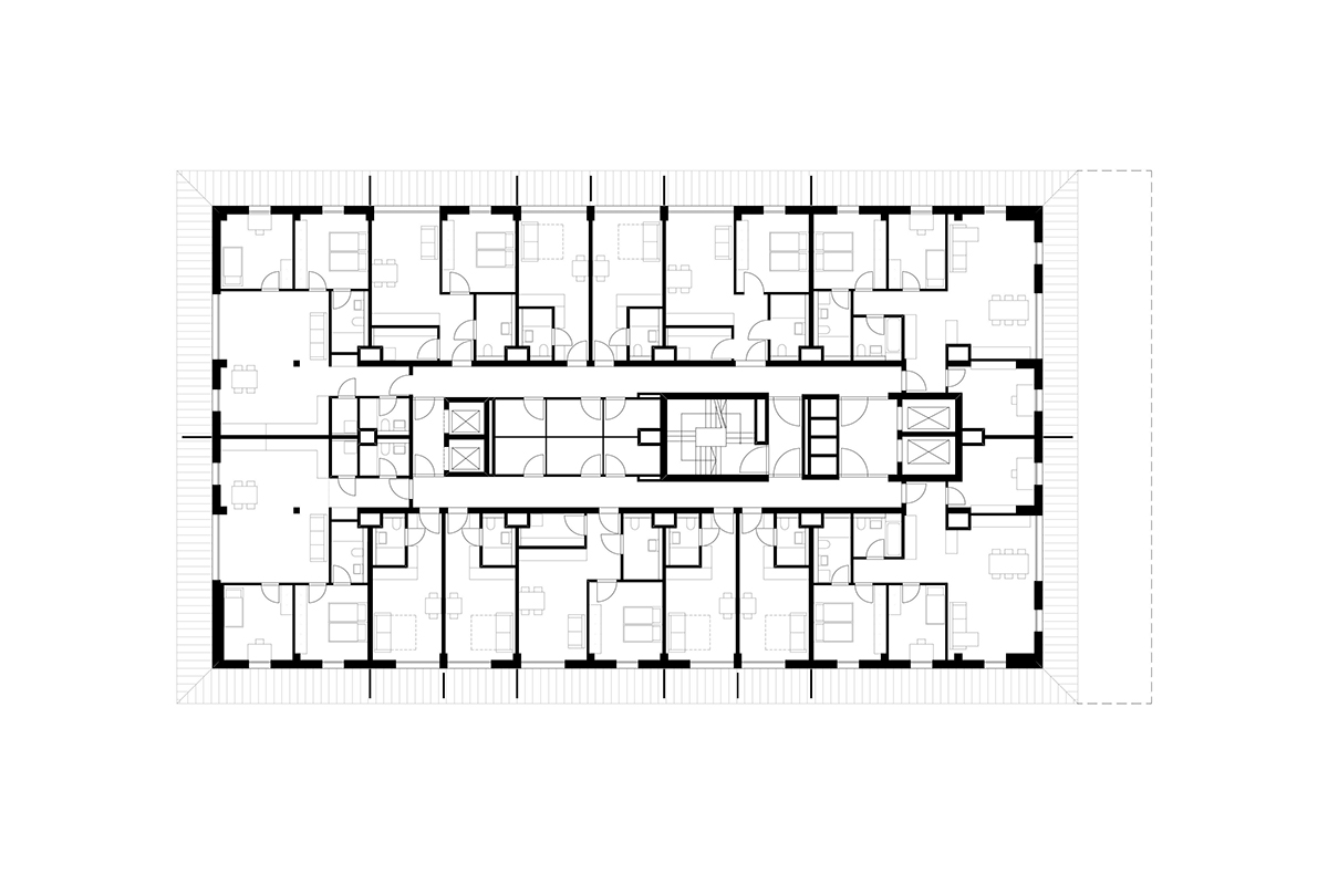 Um den Kern sind unterschiedliche Wohnungstypen (1-bis 5-Zimmer-Wohungen) angeordnet.