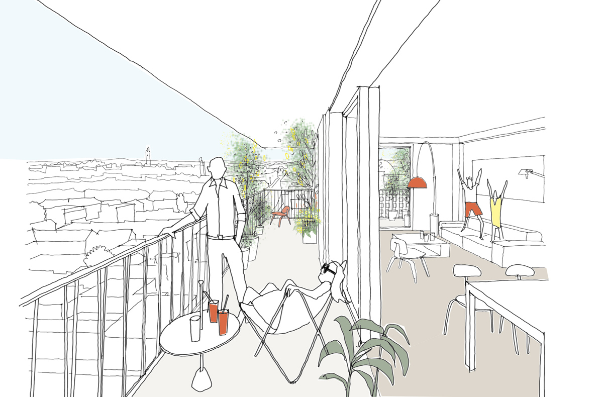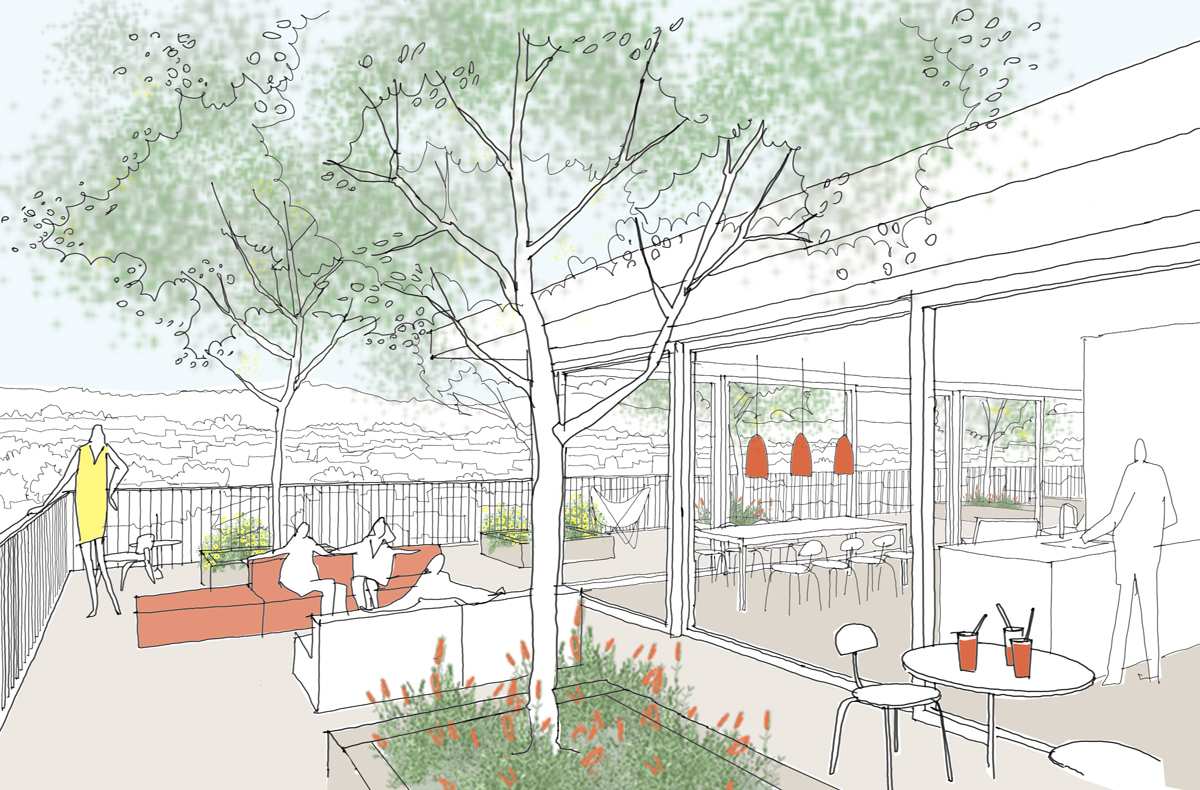 Die gemeinschaftlich genutzten Dachgärten von Mäander und Sockelbau des Hochhauses liegen auf ähnlicher Höhe und bilden eine zweite freiräumliche Ebene. Mäander und Hochhaus sind ferner über ein gemeinsames Untergeschoss bzw. eine gemeinsame Tiefgarage miteinander verbunden.