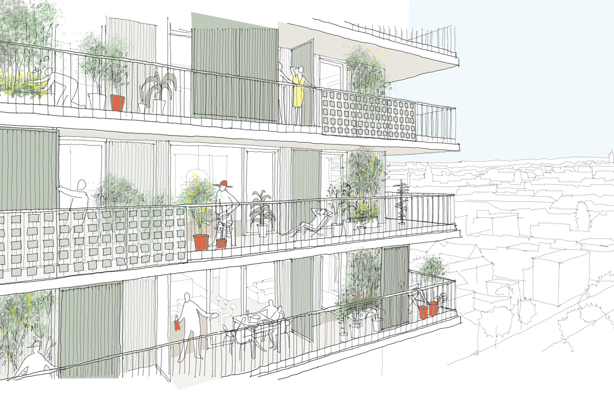 Das Erscheinungsbild des Hochhauses ist geprägt durch die horizontale Bänderung seiner umlaufenden Balkone.